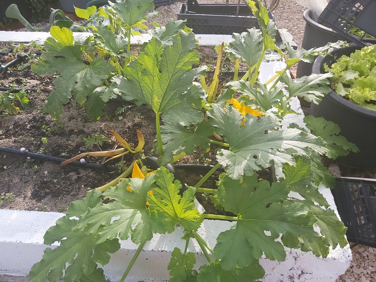 I continue to hand pollinate the courgettes which is fun. Trying to find male and female flowers open at the same time is proving quite a challenge. So far I’ve had two courgettes weighing in at nearly 800g and there is another waiting to be picked.