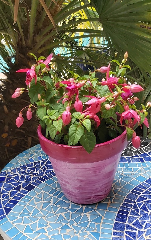 I couldn’t decide on a Birthday present, so I bought a pretty pink fuchsia and decorated a pot to match the flowers.