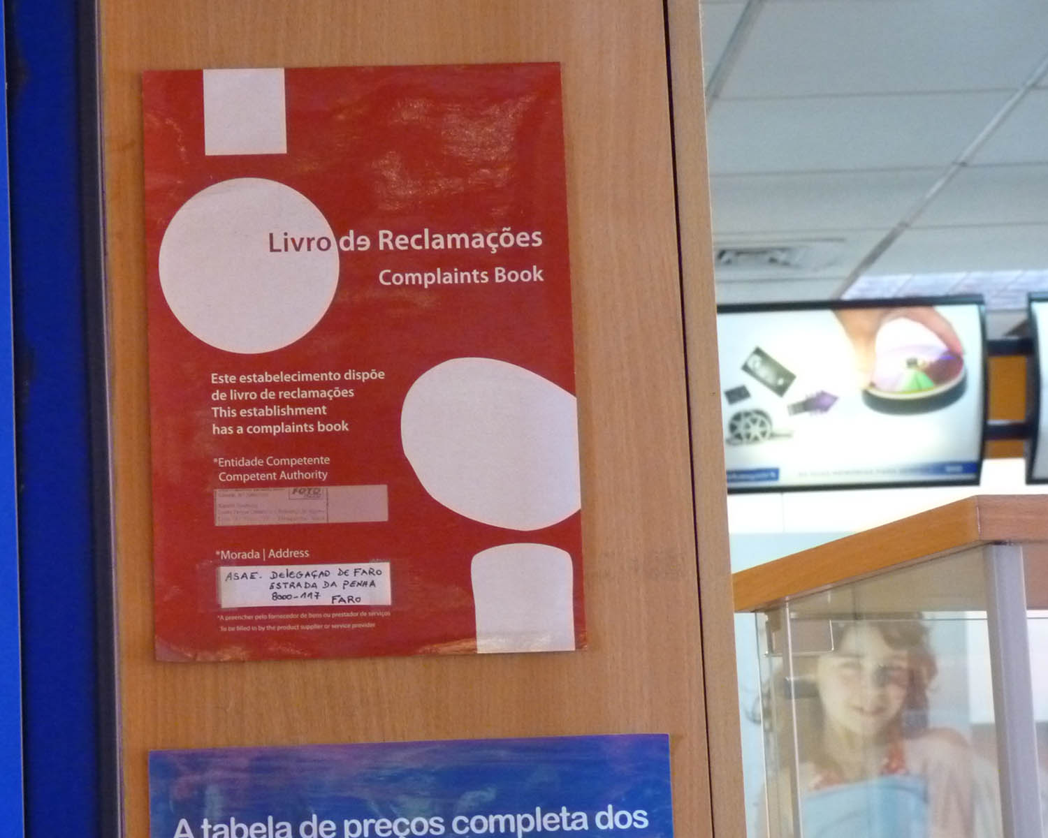 All establishments with a complaints book MUST clearly display the poster. “This establishment has book of complaints” I was recently in a shopping centre in the Algarve and tested the theory and yes some notices were clearly visible.