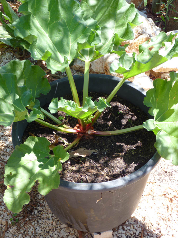 My solitary Rhubarb plant, kindly donated by a friend who had grown several from seed last summer, is finally producing some usable stalks and it won’t be long before we have our first Rhubarb Crumble desert since moving to Portugal. However, I suspect I will have to transplant to the ground this coming winter. Apparently, they do not grow well in pots on a long-term basis.
