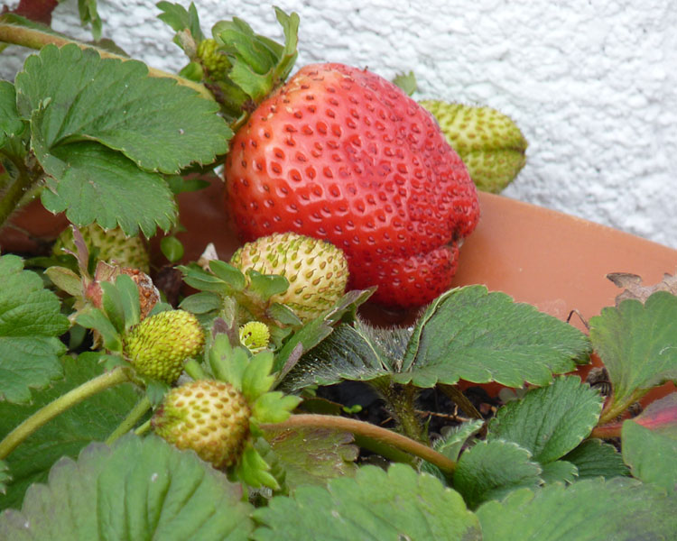 My strawberry plants are still producing an abundance of enormous sweet strawberries in January. This is a first! Strawberries have never grown in my garden at this time of the year. This ripe strawberry is just one of many. They are not even undercover.
