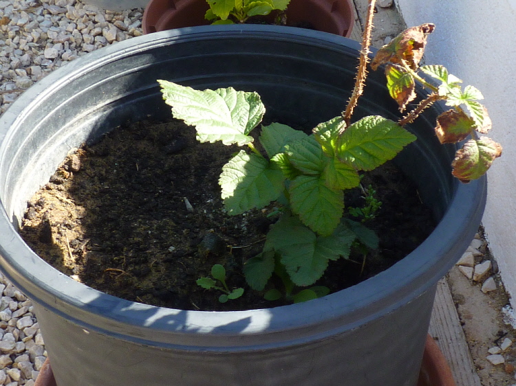 I bought this fruit plant at a charity flea market for just €2.00 All I know is that its fruit is a cross between a rasberry and a blackberry and it needs to be kept moist. I am going to transplant into a larger pot next year. Any ideas?