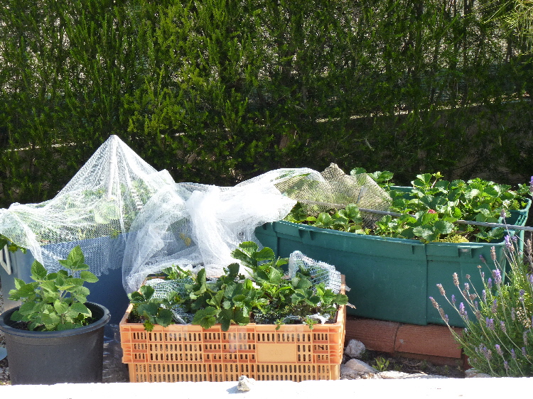 The blackbirds have discovered my delicious strawberries so I’ve now covered the plants with mosquito nets which I bought very cheaply at a local flea market. However, I need to think of an alternative option because once the nets are wet they cling to the plants and the birds just peck through them.