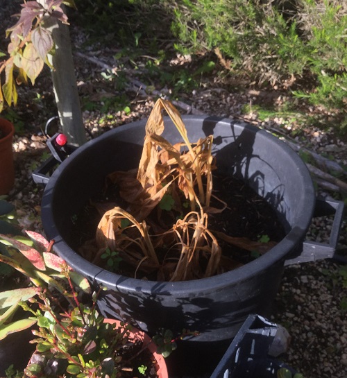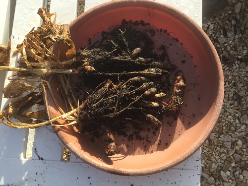 I can’t move the main pot (it’s way too big) but I could replant the ‘tubers’? I’ve lifted and put undercover on the terrace. Maybe the frost and wet killed off the leaves. We will see,