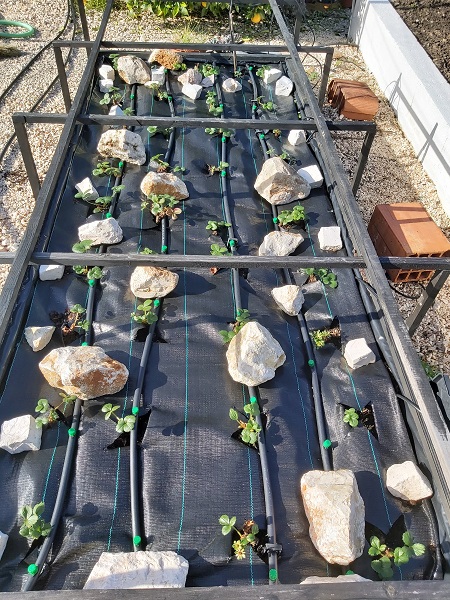 We removed lots of roots (no idea where they came from), turned over the soil and fertilized with processed horse manure and blood fish and bonemeal. The area was then covered with a membrane before replanting the strawberries and installing an independent drip irrigation system. (apparently, you should not use spray irrigation on strawberries as it encourages strawberry blight) Let’s hope we are rewarded with lots of strawberries this year.