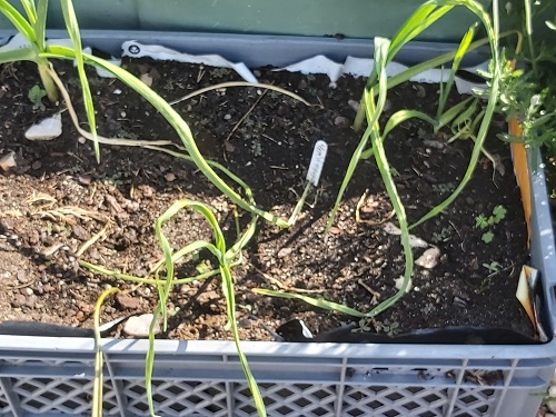 The garlic cloves planted in the crate are not fairing so well. That said, at least the leaves are still green.