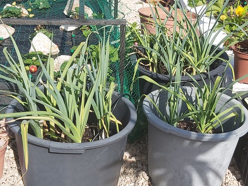 The leeks plugs purchased from the garden centre on 2nd 12th and potted on in pts 43 x 31 cm seem to be doing well. In between the leeks I planted garlic gloves on the 5th of January. I only half-filled the pots as an experiment. We will see.