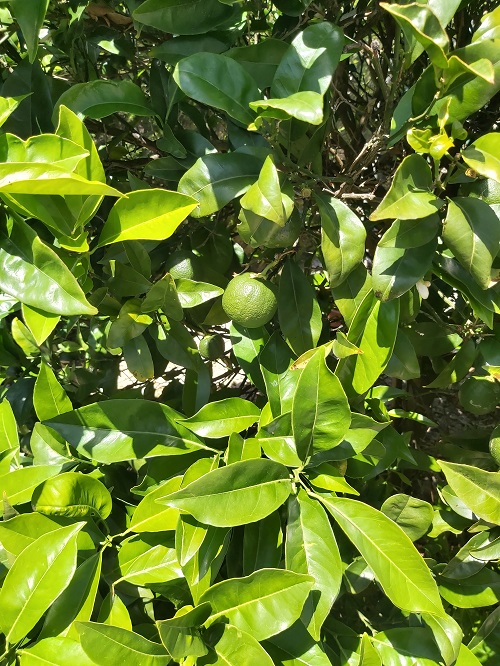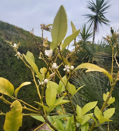 I will call this an orange bush as opposed to a tree due to the way it’s adapted to the harsh salt sea winds should it dare poke its head above the protection of the hedge. It is always either in flower or in various stages of fruit production. Although it was orginally bought as a Christmas orange tree it has long forgotten its origens and prodces randowm crops of fruit throughout the year.