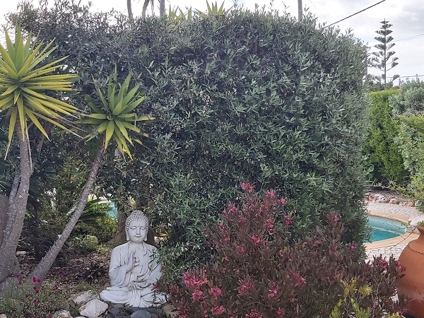 Although we have three olive trees, we’ve never really had any olives. The one pictured below, which I bought as a spindly twig in the centre aisle at Lidyls, decided it is better suited to form a hedge which screens the pool. I like the idea of a edible hegge, however, nature conspires againts me. Currently covered with blossom which is turning into tiny olives that is as far as it usually progresses. By the time the olive form they have contracted a disease, or a fly has impregnated them with whatever, leaving brown marks on the olvies whi rednders them inedible.