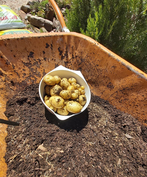 Pot 1: Size 43mm x 41mm pot. Planted in January-ish. Harvest: 1.95 kg. The leaves got blight before the plant flowered. They were not seed potatoes so we were happy with the crop.