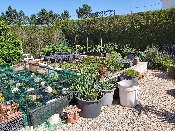 Gnome planted up the last of the potatoes in pots and some pea seeds where the black crates are in the far corner of the large beds.