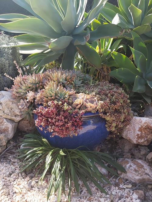 I continue to be delighted by how well my succulents grow in pots. During the heat of the summer, I moved many of my succulents into the dappled shade to give them some respite from the scorching temperatures of the mid-day sun. Pot-grown succulents do offer greater flexibility, especially when temperatures soar to the high thirties as they have on several occasions this year.