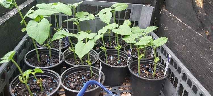 The processor bean seeds sown on March 8th are now ready for planting in the old strawberry bed, which I have dressed with manure, more compost, and Epsom salts.