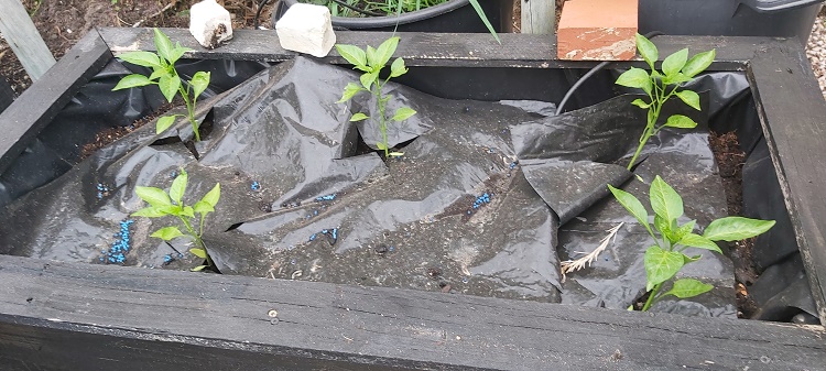 The yellow pepper seed plugs I bought at the market a month ago are now ready for planting on into the raised bed. I had six, but a gang of snails ate one.