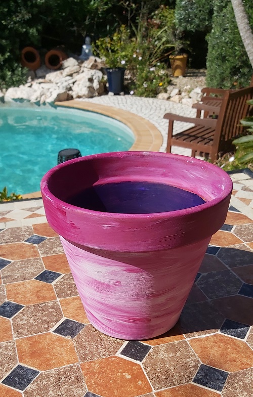 I couldn’t decide on a Birthday present, so I bought a pretty pink fuchsia and decorated a pot to match the flowers.