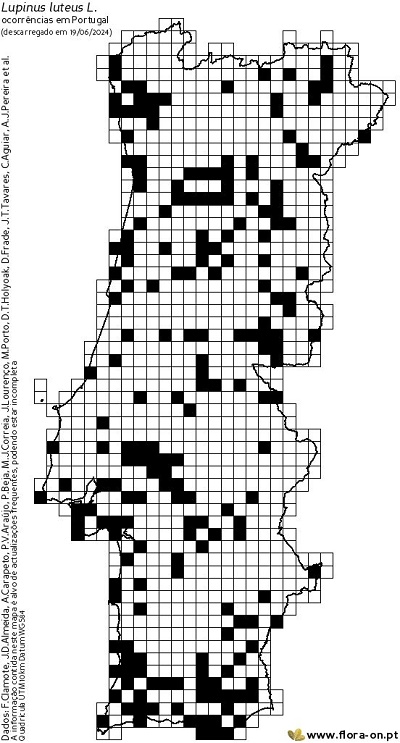 F.Clamote, J.D.Almeida, A.Carapeto, P.V.Araújo, P.Beja, M.J.Correia, J.Lourenço, M.Porto, et al. (2024). Lupinus luteus L. – mapa de distribuição. Flora-On: Flora de Portugal Interactiva, Sociedade Portuguesa de Botânica. http://www.flora-on.pt/#wLupinus+luteus. Consulta realizada em 19/06/2024