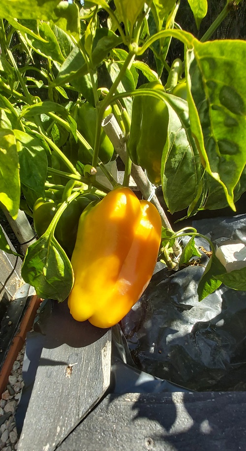 I was delighted to return home from vacation to discover the yellow peppers I bought as seed plugs back in February and planted in the raised bed in March were now yielding delicious, sweet yellow peppers. Yellow peppers are really expensive to buy, so a win!