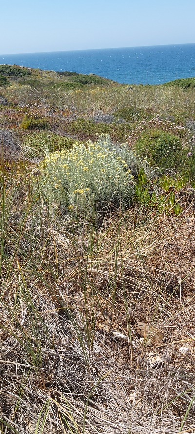 I love the Helichrysum Italicum, or as I sometimes refer to it, the ‘curry plant’, because of its curry-scented leaves. According to Wikipedia, other common names include Italian strawflower and immortelle. It grows on rocky or sandy ground and can reach up to 60cm high. After picking, the yellow flowers retain their colour and can be used in dried flower arrangements. Interesting. I never realised this.
