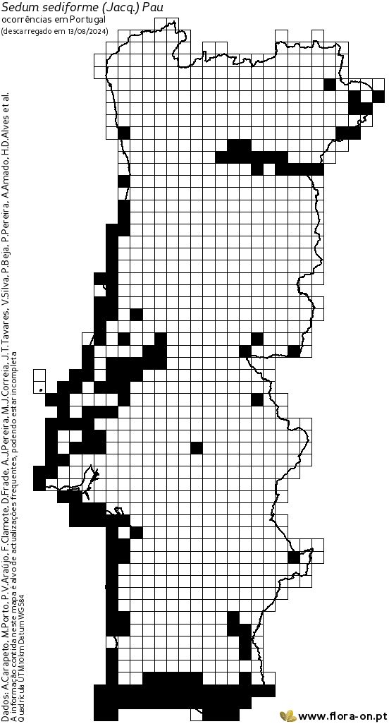 A.Carapeto, M.Porto, P.V.Araújo, F.Clamote, D.Frade, A.J.Pereira, M.J.Correia, J.T.Tavares, et al. (2024). Sedum sediforme (Jacq.) Pau – mapa de distribuição. Flora-On: Flora de Portugal Interactiva, Sociedade Portuguesa de Botânica. http://www.flora-on.pt/#wSedum+sediforme. Consulta realizada em 13/08/2024