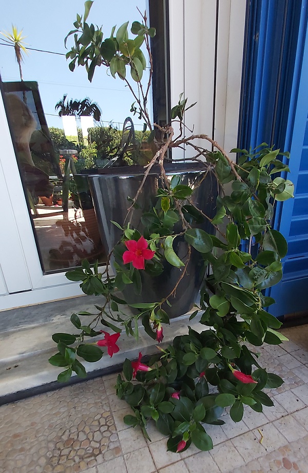 I removed the plant from the pot, which was also infested with mealy bugs. Released the crusty soil, washed the roots, and then repotted the plant in a new pot with general-purpose compost. Although Dipladenia grows well in full sun or partial shade, I’ve sited the pot in a sheltered position with late afternoon sun until it recovers from so much attention.