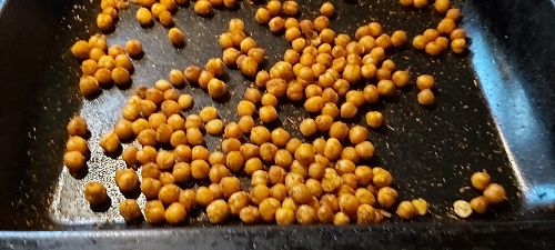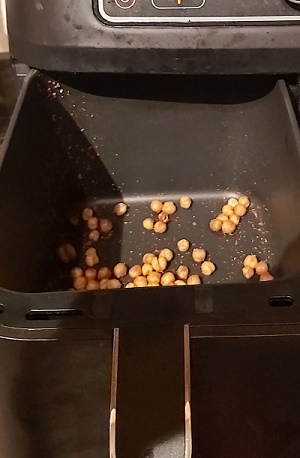 I removed the skins, dried the chickpeas, and coated them in olive oil and curry powder. I cooked in the conventional oven for 15 minutes at 200C. They were still soft, but rather than leaving them to crisp in the oven, I finished them in the Ninja Air Fryer for quickness. Selected the Air Fry setting and cooked at 200c for 7 mins. I heard a few popping sounds and assumed they were cooked, and they were! For me delicious–not so for Mr. Piglet. The coating needed more work. Maybe I’ll try garlic and mixed herbs for the next batch.