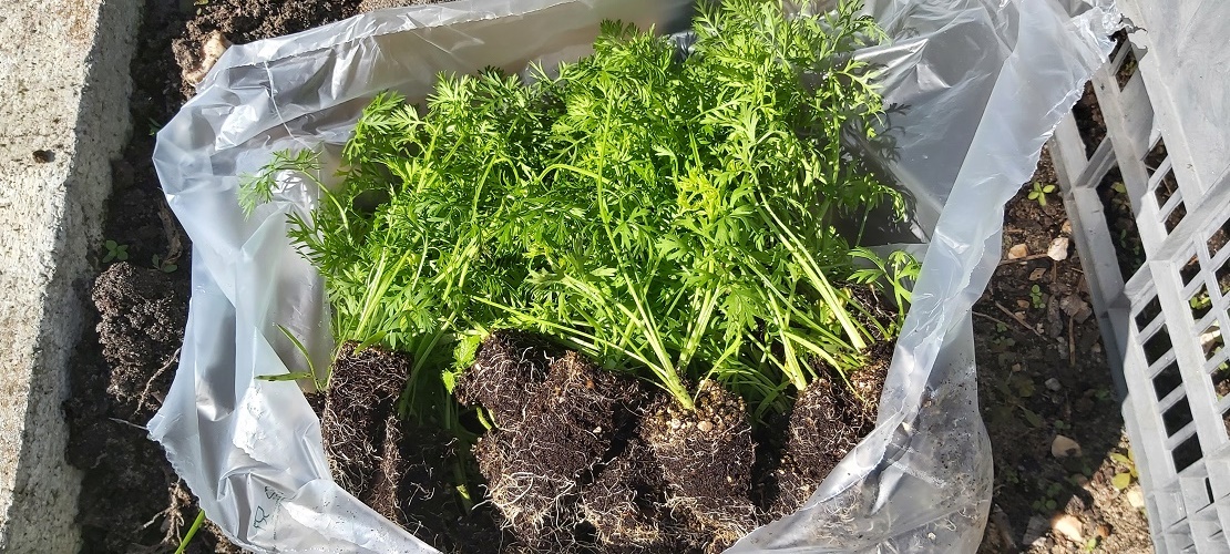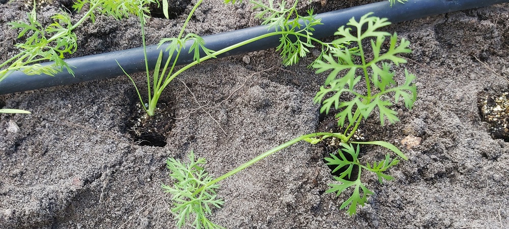 A couple of years ago, I was advised that to avoid deformed carrots when using plugs, the hole should be deep enough to accommodate the roots with plenty of space so you don’t damage the carrot’s growing tip. Then, water in the surrounding earth with the top of the plug just below the surface.