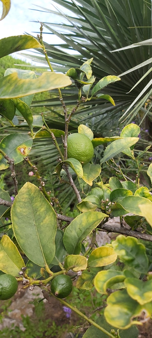 Lime Tree: I watered it monthly with homemade liquid horse manure, and it seems to have paid off. There are several small limes and flowers. However, the yellow mottled leaves indicate it is still lacking something.