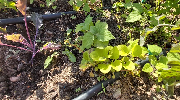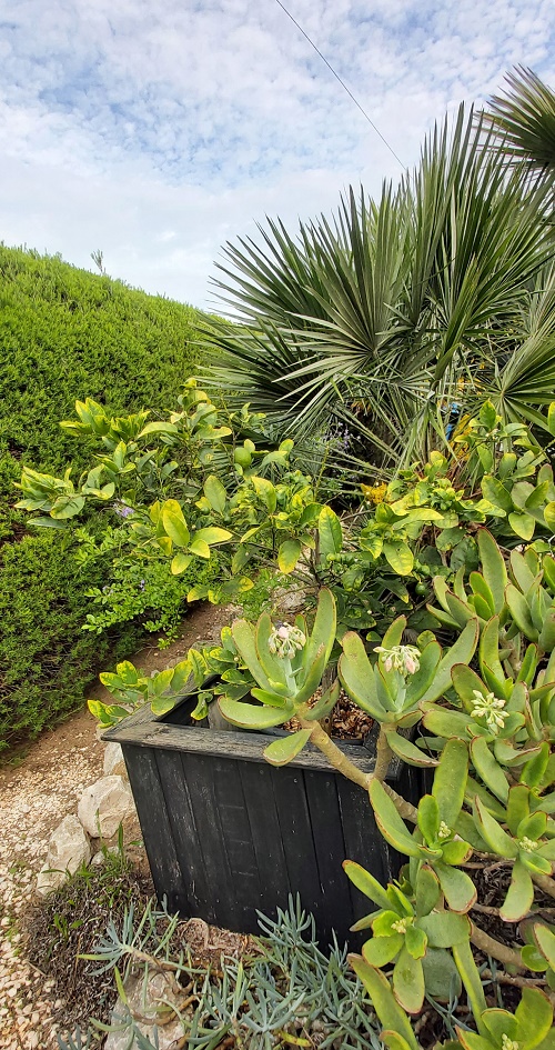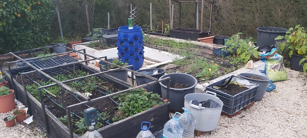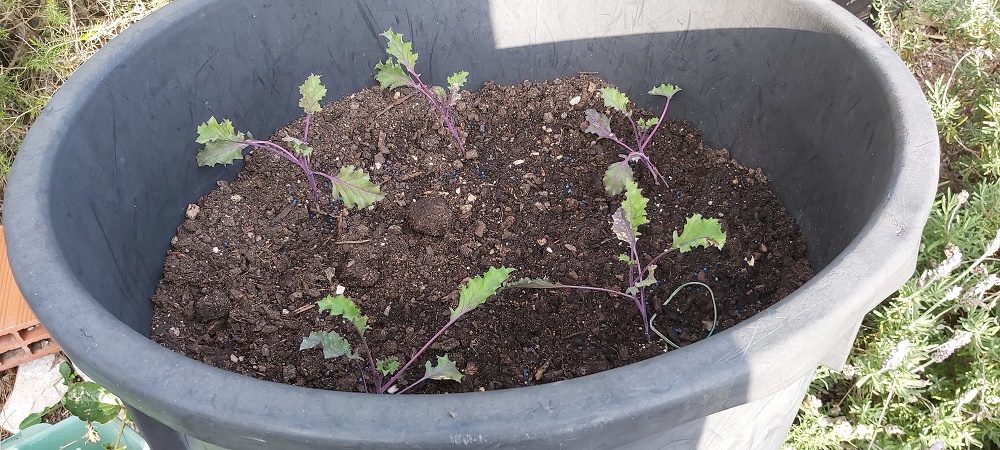 We also bought some purple kale plugs at Rogil market and planted them in the huge black flowerpot. Yes, they are overcrowded, but I am working on the principle that not all of them will survive