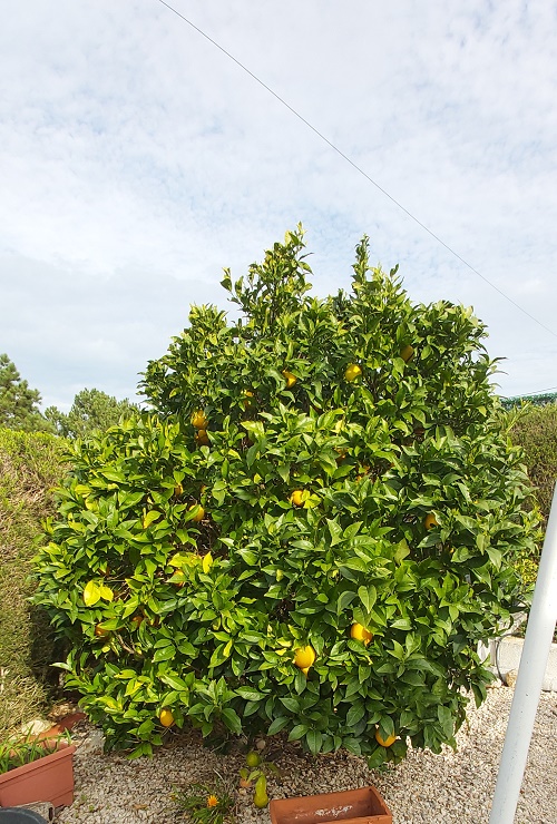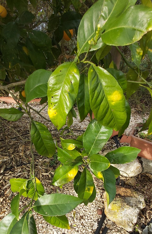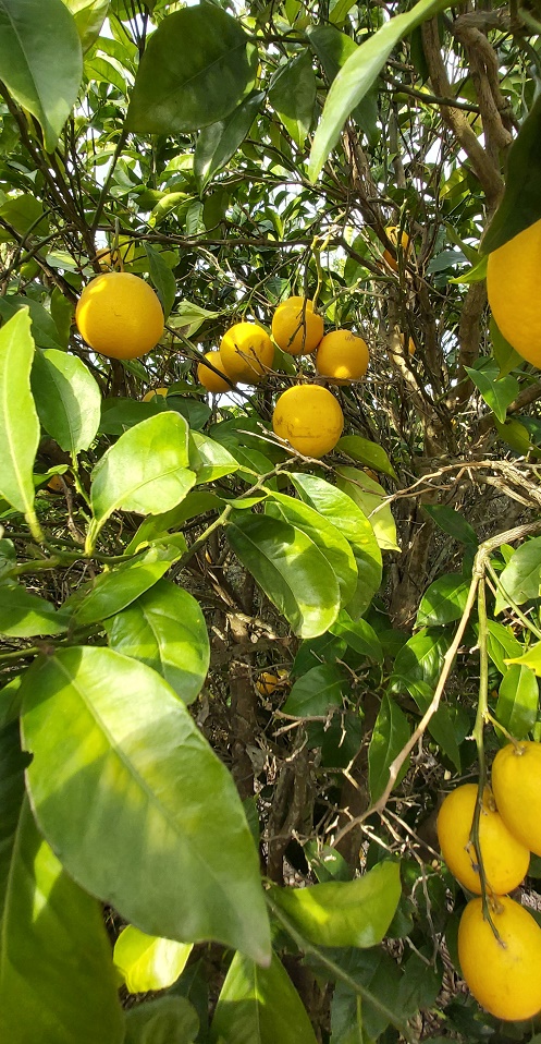 We have lots of oranges, but unfortunately, this year they are tart. I notice some of the leaves also have yellow patches.