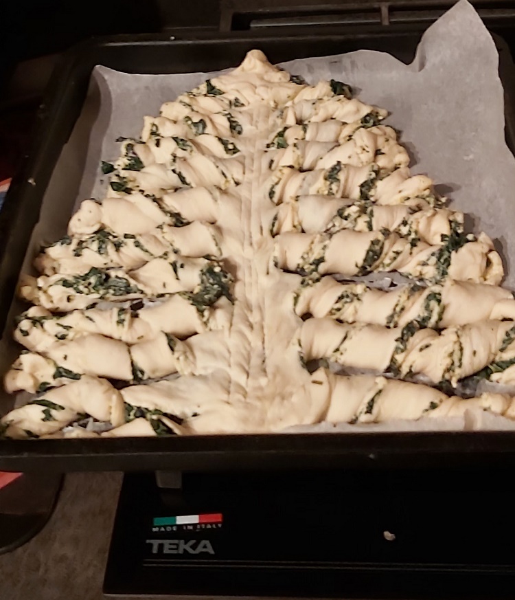 Roll out the pizza dough. Cut as indicated as per https://www.itsalwaysautumn.com/christmas-tree-spinach-dip-breadsticks.html. (I wanted to photograph each stage but my granddaughter, nudged grandma out of the way, took control and she never had the patience for photographs)
