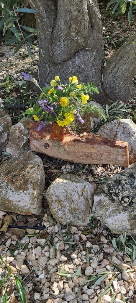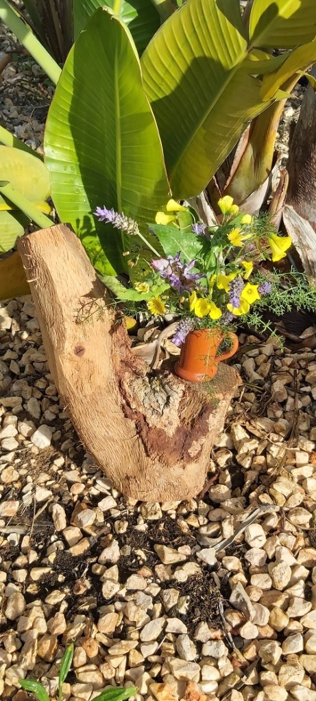 For this week’s ‘In a Vase on Monday, ‘ the freesias I’d planned to use were still not in bloom. Stumped for ideas, I looked around for a theme inspiration. Bees. Bees are attracted to certain plants. Next, I needed a receptacle. I spotted a Portuguese terracotta shot mug and a log.