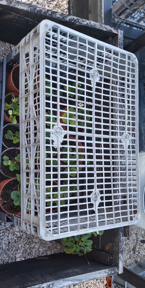 You may be wondering, or not, why I covered all the pots with an open weave crate. Here’s the thing: birds. In their search for worms, they toss the newly planted strawberries aside.