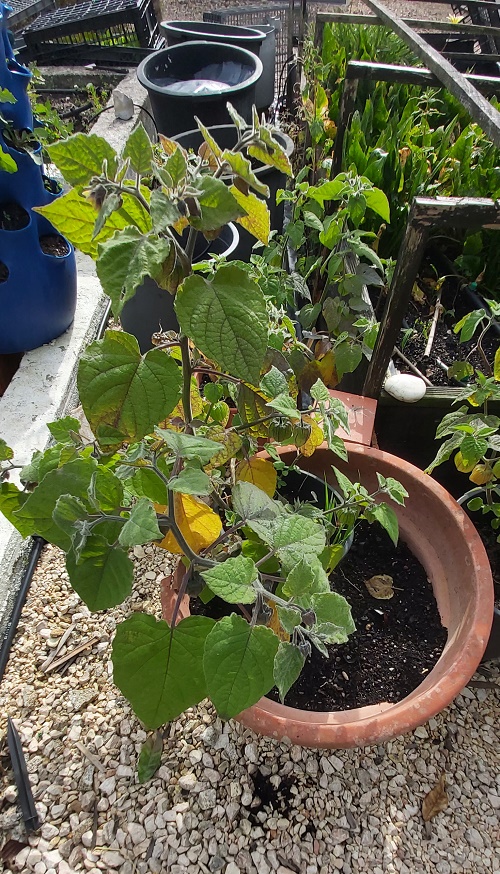Physalis grow like weeds throughout the year in our garden. Drop a couple of squashed fruits into a pot, cover with soil, water, and hey presto! And like weeds, they even grow in the gravel.