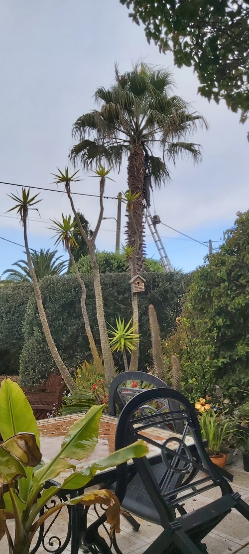 ~Only a couple of weeks ago I was moaning to Mr. Piglet, and on my blog, how scruffy Washingtonia’s become once you can no longer remove the dead leaves due to its height and how unsuitable I felt it was for small urban gardens. So …. you can imagine my surprise when during yet another downpour of rain an enterprising gentleman called Mohammad appeared at our gate asking if we wanted our palm tree trimmed. My reaction was intitially very much the same as if a crew of chancer tarmacers arrived at my door telling me they had some tarmac spare from a job they’d completed up the road and did we want our drive/path tarmaced. This is a well-known scam in the UK. You say yes, you pay them cash and two weeks later you have weeds growing up through the tarmac.