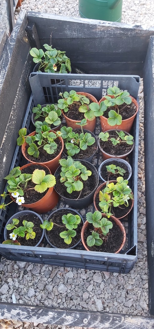 Thanks to the central watering system method (more on that another time), my vertical strawberry planter became infested with fruit flies. I evacuated all the strawberry plants and rehomed them in temporary accommodation. Dodging showers over the last week, I repotted each plant individually to encourage growth before I replanted in the vertical planter.