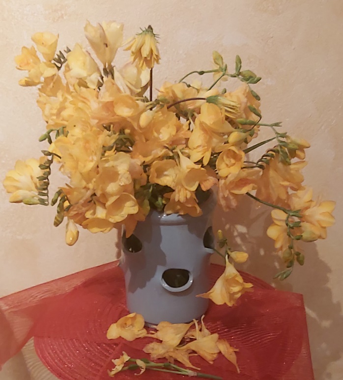 The freesias are wonderful in their abundance, but the deliberate inclusion of dead blooms is clearly of significance