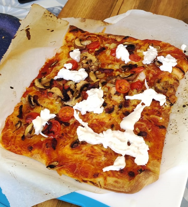 The Ninja BBQ-come-smoker is Mr Piglet’s baby. I added the Burrata morzerella cheese to the pizza. We still disagree whether the Burrata cheese should have been cooked. I preferred it uncooked. What do you think?