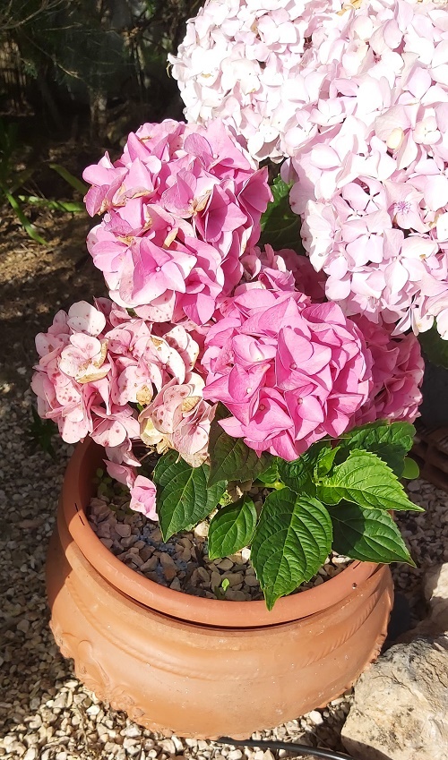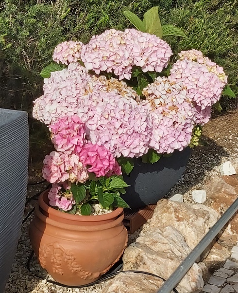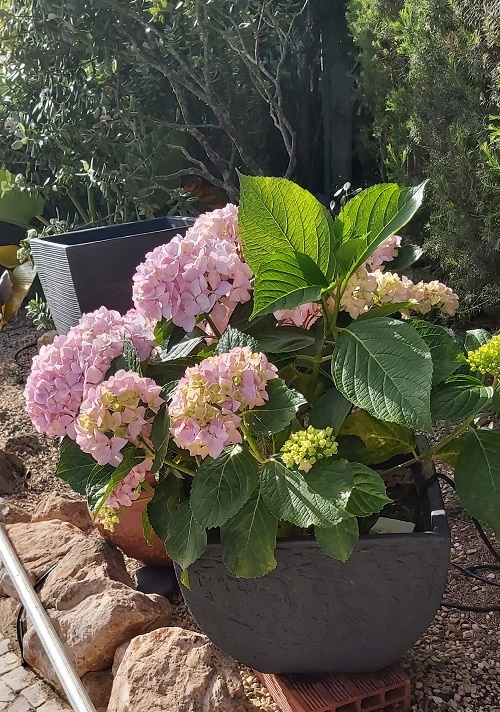 I agree with Chloris, these potted hydrangeas are so beautiful , but on the other hand they must be very water-hungry. Have you installed an automatic watering system here too? Bravo for the strelitzia, a plant that I don’t have here yet, despite a number of exotics…