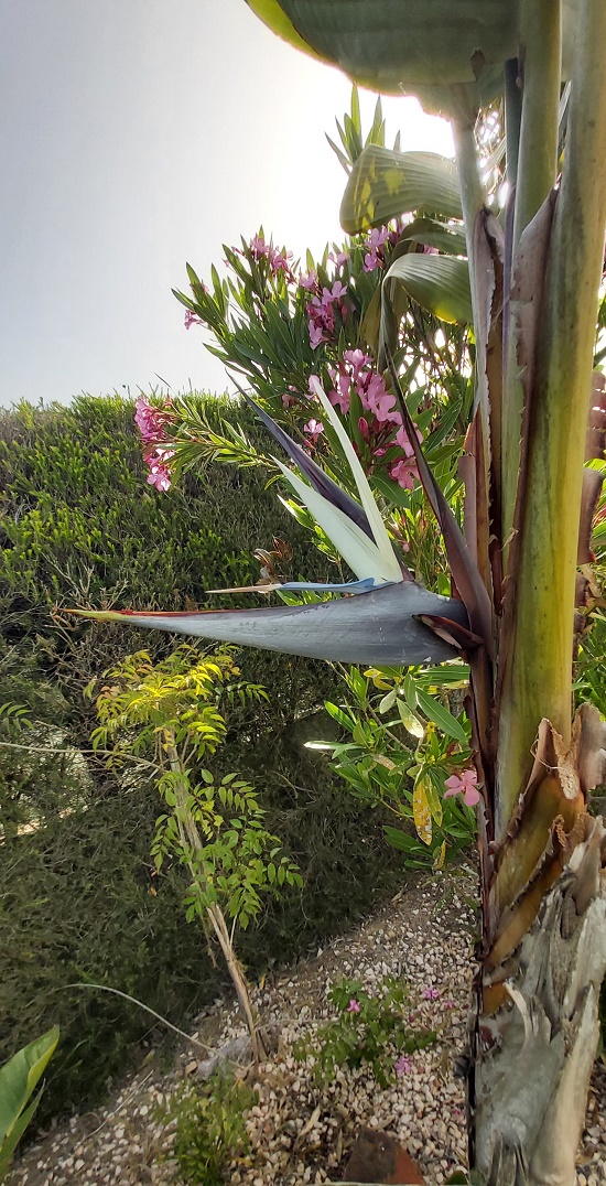 We were delighted to see that after many barren years, the Strelitzia Nicolai finally flowered—just one, but that’s okay.