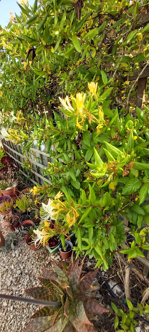 Over fifteen years ago, I took a cutting of a friend’s honeysuckle, which I admired. This is the first year it has really come into its own, not only flowering profusely but actually sending out an abundance of new shoots so we can hopefully conceal the ugly log pile and junk area, which we’ve dubbed the ‘technical area’