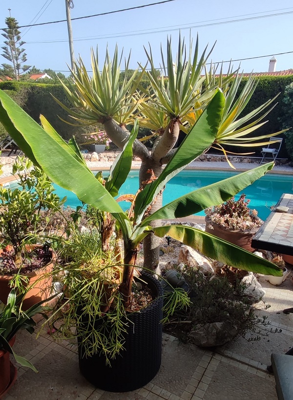 The calla lilies, here in the ground, are always eaten by slugs, and I don’t get much use out of the flowering. I agree, the banana tree needs a bigger pot, and certainly with richer soil to encourage a new growth.
