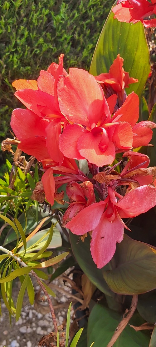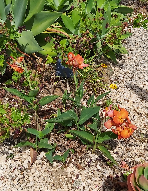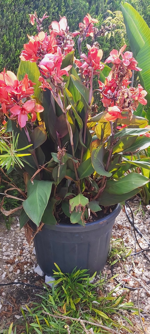 At least the Cannas growing in a large pot do not need to share water with the roots from other plants and the thirsty hedge.