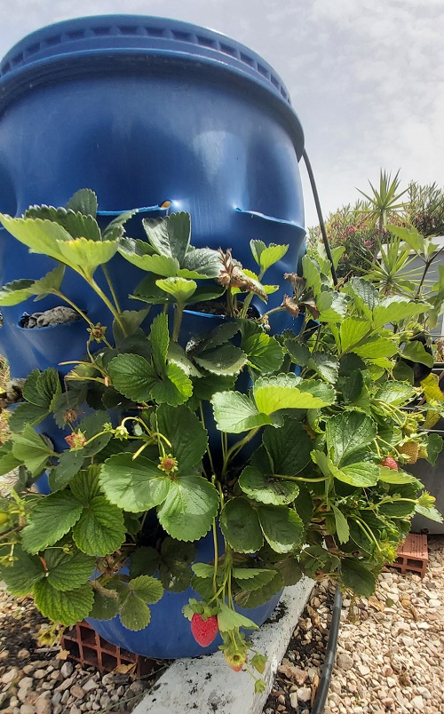Thanks, Tracy. I am suprised the strawberries are doing so well. Once the roots establish they seem to like the virtical planter. Auberines, I can only eat so many so the four plants will hopefully carry me through.