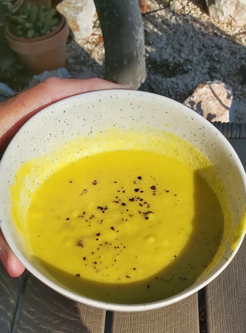 Putting aside the temptation to follow one of the online recipes, I followed the instructions as laid out in the book. Result: The soup was watery, and if I had added the yoghurt to the boiling soup as instructed, it would have curdled. I did misread the quantity of turmeric, which produced interesting DayGlo results and made the soup appear radioactive.