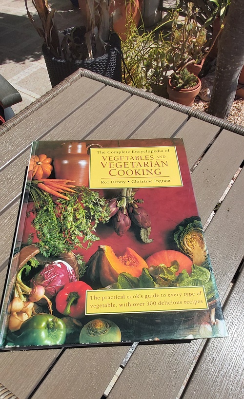 Last week, during my shift at the charity shop, I spotted a vegetarian cookery book for sale. ‘The Complete Encyclopedia of Vegetables and Vegetarian Cooking with Roz Denny and Christine Ingram‘. I do love books where each recipe is supported by a picture. I don’t know why, because many of my offerings rarely resemble those in the book, but I can dream, yes? I ummed and ahhed whether to buy it, as I already had a bookcase full of cookery and diet books that I rarely used. Why did I want more when I could source all the latest recipes online?