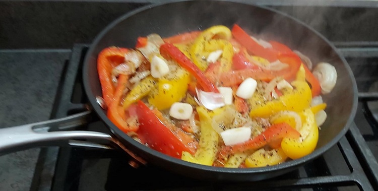 - Slice onions. Add a drop of olive oil to the pan, add onions and cover with the lid so the onions sweat. Once soft