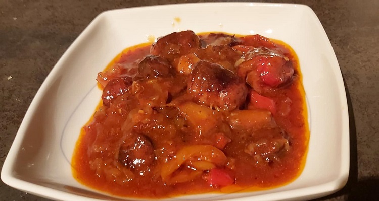 I served with mashed potatoes. Equally, I could have added potatoes to the mix, so it was a proper one-pot meal. I will try that next time.