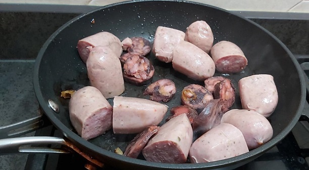 3. Cut sausages into 4. Less if sausages are short and stumpy. Slice chorizo. Brown both in the pan. (Do not add oil as there will be enough fat from chorizo and sausages).