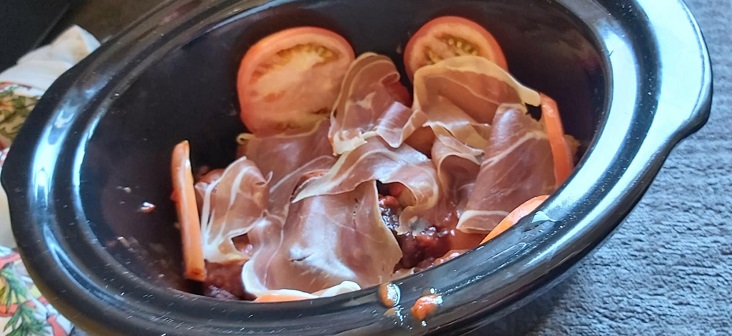 5 Slice up the tomatoes and arrange around the side of the crockpot. Top with several slices of presunto.