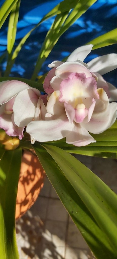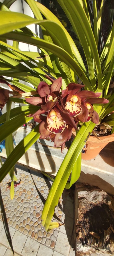 Between juggling health issues, visitors, trips away, funerals, storms, rain, etc., I’ve ignored my garden over the last few months and left it mainly to its own devices, so I was delighted to discover that both my Cymbidium orchids are in flower!